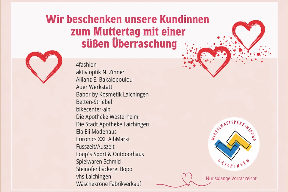 Alle teilnehmenden Betriebe verschenken in der Muttertagswoche schön verzierte Keks-Herzen an alle Frauen! Ob Großmutter, Mutter, Tante oder einfach nur Frau – an diesem Tag feiern wir Euch alle! Dies ist eine wunderschöne Gelegenheit einfach mal „DANKE“ zu sagen an alle wunderbaren Frauen.